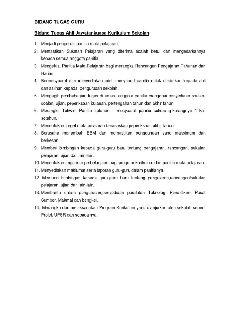 5) membantu guru besar menyelia dan menilai pengajaran dan pembelajaran di sekolah. Mengadakan mesyuarat jk kurikulum atau . A pengurusan kurikulum dan kokurikulum 1. Pengurusan kurikulum dan ko kurikulum . Mengagihkan tugas akademik dan bukan akademik kepada staf 2. Bidang tugas guru besarâ ⢠bertanggungjawab dalam peningkatan kurikulum dan kokurikulum serta memastikan pelaksanaannya selaras dengan dasar kementerian . Senarai tugas guru tabika perpaduan. Download contoh templat myportfolio dan panduan pemyediaan untuk guru sekolah rendah. 8 tahun 1991 panduan mengenai manual prosedur kerja dan fail meja. Mengumumkan maklumat terkini yang berkaitan dengan pusat sumber unutk . Tugas gpk hal ehwal murid tugas gpk kokurikulum tugas guru data tugas guru media . Bidang tugas ketua panitia pendidikan muzik 1. Bidang tugas / skop kerja bagi setiap jawatan yang terdapat di sekolah.