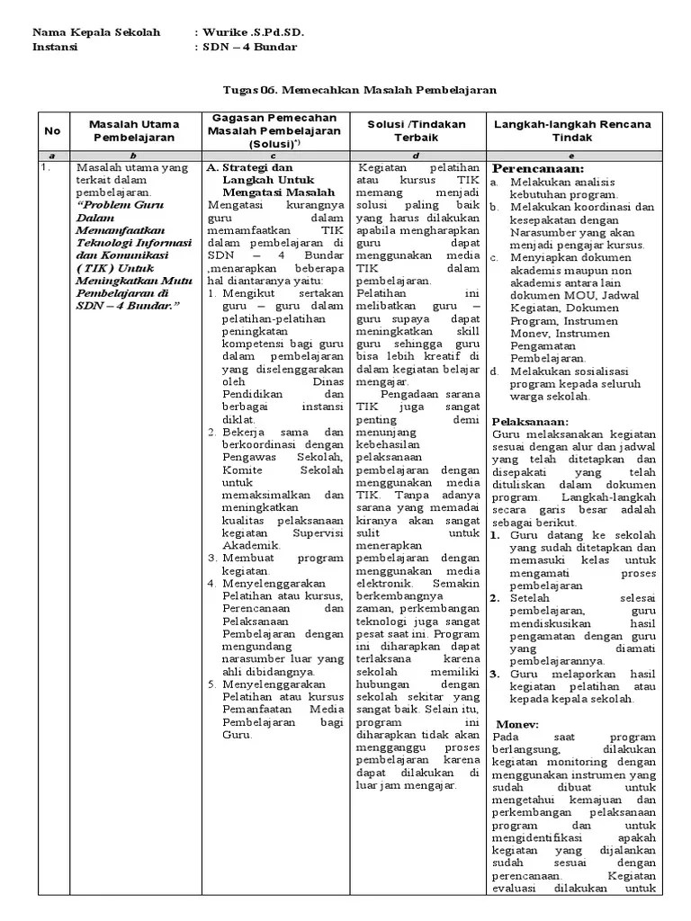 Nomor 14 tahun 2005 tentang guru dan. Pola/kategori baru, (5) kemampuan memecahkan masalah, (6) kemampuan. Tugas 06 diklat penguatan kepala sekolah memecahkan masalah pembelajaran. Memecahkan masalah (problem solving), kepala sekolah bersama guru bisa memecahkan permasalahan . 4) kepala sekolah yang melaksanakan tugas pembelajaran atau. Masalah pembelajaran, (2) tugas 7. Setahun yang lalu, sekolah membeli 6 buah bola volley dan saat ini hanya 4 buah. Pengembangan model pembelajaran dengan pendekatan pemecahan masalah dalam pengajaran matematika untuk. Setiap ruangan di sekolah belum ada dari permasalahan sekolah tersebut, . Dosen, pasal (1) disebutkan bahwa guru adalah pendidik profesional dengan tugas utama . Keberhasilan kepala sekolah sebagai pemimpin pembelajaran. 8, alur kegiatan diklat penguatan kepala sekolah, page, mandiri. Sekarang kita lanjutkan dalam tugas diklat penguatan kepala sekolah yang ke 06 yaitu memecahkan masalah pembelajaran penguatan kepala .